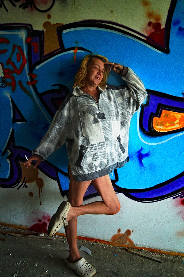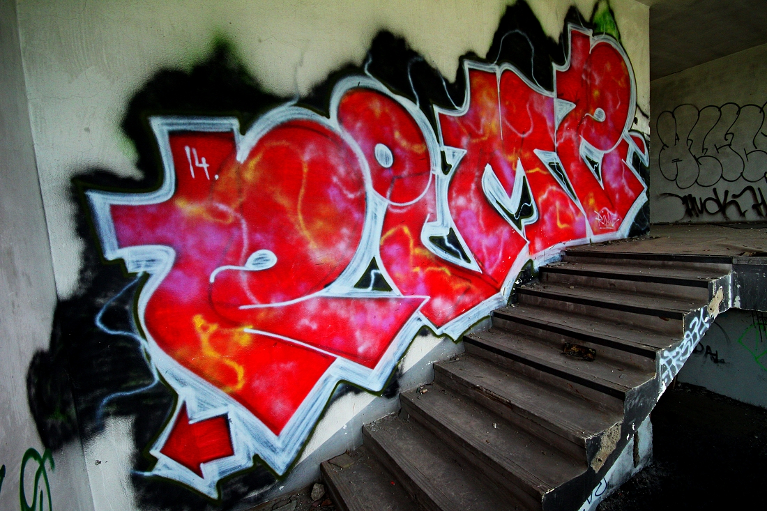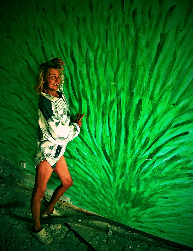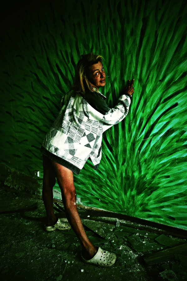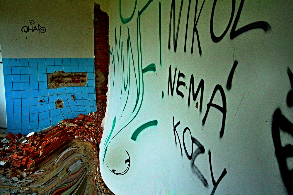 .. ..Divné. Bylo to celé divné. Přemýšlel jsem zda uvedené fotografie vůbec uveřejnit. Ale dostal jsem výslovný souhlas, nejen s focením, ale i se zveřejněním. Jednou se tam vrátím.Vrátil jsem se. Najednou, bylo asi 13 hodin dne 29.8.2016, se náhle zatmělo a zahřmělo...jakobysi temný síly řekly A DOST.. ...................................... Ten pozdně letní den bylo po dlouhé době oblačno a občas se i mračno zamračilo. K Aeru jsem jel cíleně, potřeboval jsem tam dovyfotit některé scenérie, které v hodně pozdním odpoledni prostě navyšly.. bylo bezvětří, a v dáli jsem viděl malý tmavý bouřový mrak, však je dosti času, pomyslíte si, slunce svítilo a ... ...Přiznám se, neměl jsem z toho dobrý pocit, už posledně jsem cítil Ty děsivé siločáry zla zhmotněné mezi jednotlivými grafitti, ta jejich negativní energie jakoby se propojila, byla příliš silná na to aby ji mohl rozbít jediný člověk, však je také jediný člověk nevytvořil, přesto jsem Je poznával, jak jsem postupně procházel jednotlivá bezútěšná podlaží této rozlehlé budovy, jaksi si uvědomíte, že tenhle divně zlej prostor prostě sami nezvládnete, i když to tu už skoro znáte.. potřetí jsem určitě nepůjdu, ani za nic... Náhle se sešeřilo a setmělo. Náhle zahřměl hrom. Docela blízko. Udiveně se ohlédnete. To není možný, řeknete si, vždyť ten mrak byl tak daleko. Další zahřmění, náhle se zattmělo ještě víc... Uvědomíte si, že tohle už není normální bouřka, žádnej vítr, žádnej déšť. Jakoby všechny síly zla vycházejíce z grafitti vymalovaných do vomítek temnými silami lidské duše, řekly a dost, nemáš tady co dělat člověče.. . V temné sešeřelé chodbě ponuré budovy se najednou v dáli něco pohnulo. zamraZÍ vÁS. Objevila se temná silueta postavy. V temným prostoru.. Zamrazí Vás DOOPRAVDY, je to opravdu děs i pro velkýho mužskýho. Nikde nikdo. Ani se nepohnete..možná znáte ten pocit mrazení, kdy se Vám celý tělo chvěje a neuděláte Nic. Postava se pohnula. Pomalu se mlčky blížila... Pomyslíte si ledacos. .. taky Vás napadne, že o Vás vlastně nikdo neví, že jste právě tady v tom děsuběsu. Sahnete podvědomě po mobilu. Není signál. To není možný.. Tajemná postava, když už jsem v přítmí rozeznával její obrysy byla ... ...menuju se Niki, slyším najednou skřehotavý hlas, který s ozvěnou pronikl děsným potemnělým vopuštěným prostorem, co tady děláš ? Ta děsivá postava byla ONA, žena... soorrryi ,.. dal se jí cigárrroo. nekouřim, měl se je pro sichrr ssebou.. zapálila si. i... mi, bidleli sme tady. kdisi. s tim mým. sem fotografka. bejvalá. bejvala. sem teď tady. zimu nepřežijem. dík že si přišel. můžeš fotit. a kde to bude? na www. stribro.cz je, to si budu pamatovat... ... .. .