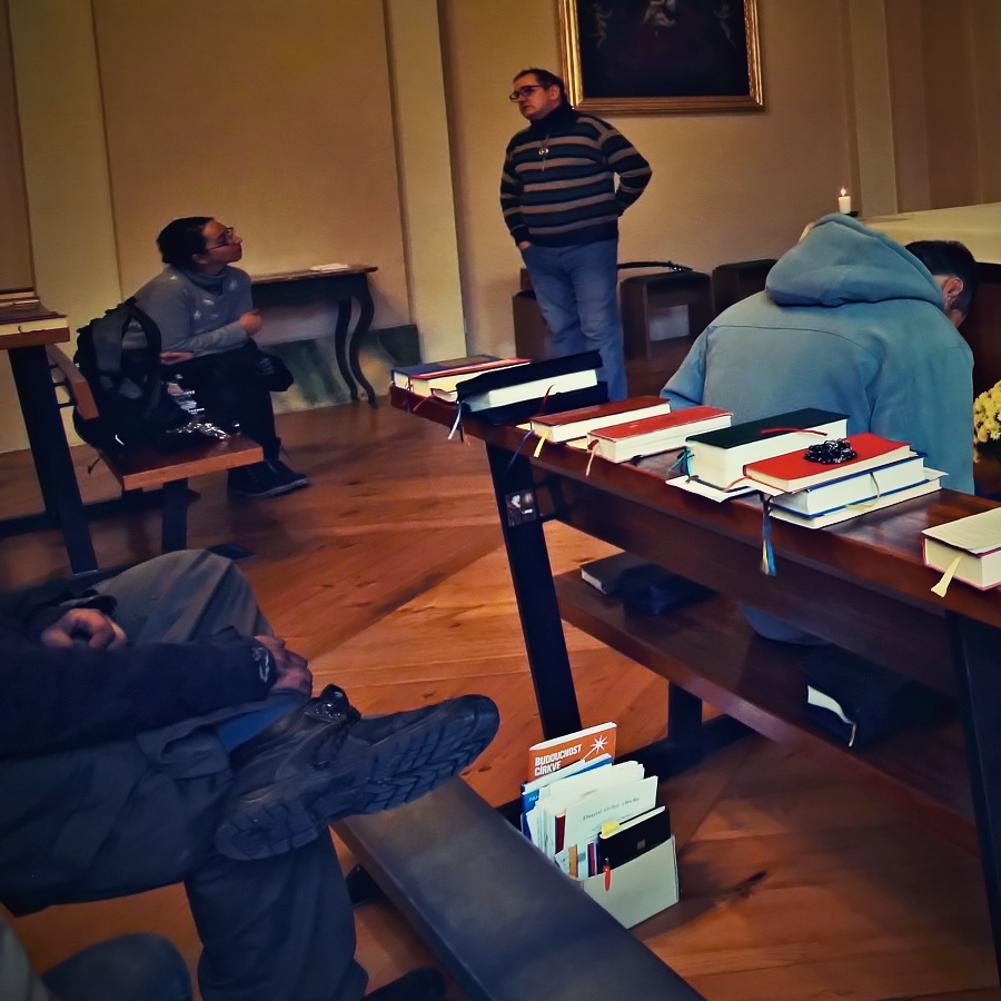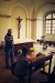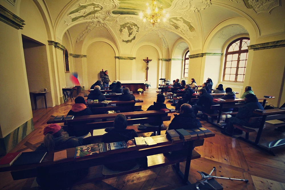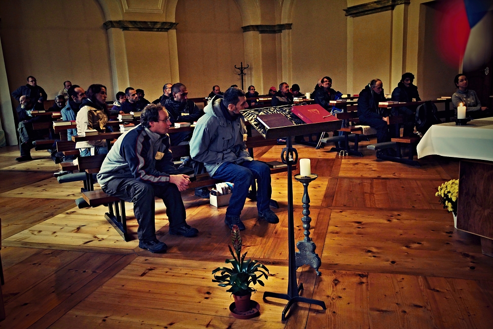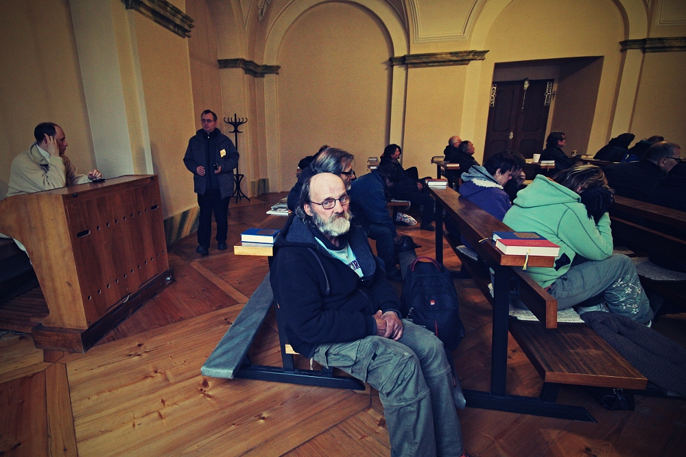 Jsou věci mezi nebem a zemí, které prostě nevymyslíte... Na státní svátek 17. listopadu jsem se chystal do Prahy. Ne ovšem proto, abych pobíhal po pražských náměstích a demonstracích, ale proto, že v kostele Sv. Ignáce na Karláku byla sloužena bohoslužba Poděkování za 27 let svobody a demokrace, plzeňským biskupem Tomášem Holubem... bohužel se stalo, že mi rodinné důvody neumožnily odjet, ale reportáž z tohoto krásného kostela ctěný čtenář stejně brzo uvidí.. Náhoda, jak tomu tak v životě bývá, nebo snad osud, mi zavály v den státního svátku do kláštera Teplá. Je tam nový prohlídkový okruh a ten stojí za TO, říká můj dobrý známý. Druhá kasa tohoto okruhu měla ovšem zavřeno, takže zklamaně postáváte před zavřenými masivními dveřmi.. dveře náhle vrzly a otevřely se. Zarostlý mladík, měl na krku visačku Josífek a s nevinným úsměvem povídá, poď dál, máme tady akci...??.. Jdete prázdnou, automatikou nasvícenou chodbou, nikde nikdo, i ten Josífek se jaksi ztratil..podivný pocit ještě umocní rozlehlá stavba Tepelského kláštera,kde snadno zabloudíte. Náhle v dáli zahlédnete sutanu kněze. První záchytný bod, rychle kráčíte za ním, jen co Vám bolavý kolena dovolí. Náhle se v dáli klášterní chodby otevřou druhý dveře. Klášterní kaple. Kněz uvidí cizího nezvanýho postaršího chlapáka s foťákem na krku. Ale Vy sem nepatříte povídá.. náhle se objeví ve dveřích Josífek, jó toho znám.. Tak teda pojďte dál, teda jestli Vám to nebude vadit... Nechápete. Pochopíte hned za dveřmi. Podivný odér,nebyl sice nijak pronikavý,ani alkoholický, a to fakt nejsem cíťa, ale byl cítit. V klášteře se konalo setkání bezdomovců z plzeňskýho kraje, přivezli je busem hlavně z Plzeňska, dobrovolníci spolu s opatstvím kláštera oslavili s těmito lidmi státní svátek. Přednáška, diskuze, pohoštění, koláč, kafčo, čaj, polívka, prohlídka... Dostal jsem povolení nafotit pár fotografiií, snad mi pomohla protekce z Domova Sv.Jiří v Plzni.. Při závěrečné modlitbě, kterou ovšem nevedl onen kněz, ale jeden z přednášejících dobrovolníků se všichni postavili do kruhu a vzali se za ruce, nedalo mi to, vzali mě mezi sebe..ještě dnes mi z toho zebe.. S velikým údivem zjistíte, že mají stejné ruce jako Vy, a lidské teplo z jejich rukou propojilo celé tohle zvláštní lidské společenství...