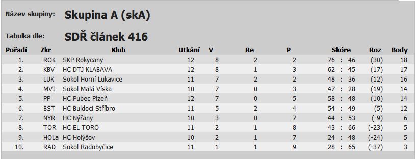 Buldoci : DTJ Klabava 7 : 7 (2:2)(4:4)(1:1) Branky: Sládek 2+2, Reiss 2+1, Šůcha 1+0, Staněk 2+1, Černoch 0+1 za Buldoky Nekola 2+2, Moravec 2 +1, Průša 2+0, Kubík 1+1, Houška 0+2 za Klabavu Vyloučení: 7 : 5 Sestava: Liška, Houdek, Červenka, Dráždil, Bobr, Staněk, Šůcha, Reiss, Sládek, Černoch, Polívka