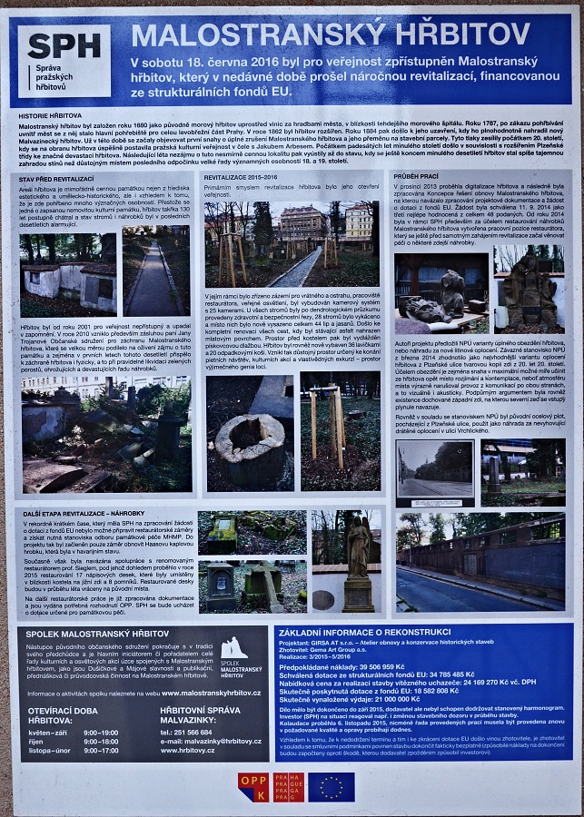 Snad stokrát Snad stokrát jsem jel kolem. Stokráte bylo zavřeno. Až jednou. Včera. Bylo otevřeno.Taktak to stačíte ubrzdit po tý hlavní dvouproudový na Praze 5. Zacouváte do jednosměrky. Zaparkujete tam kde se nemá. Měšťáci nikde. Máte štěstí. Zamračený den náhle ukáže svoji vlídnou tvář.. Malostranský hřbitov. Není tak známý jako Vyšehrad nebo třeba Olšany.Vlastně se tam už dávno nepohřbívá a zeleň Břečtanu pnoucí se po starých a přestárlých stromech jenom podtrhuje neobvyklou až mystickou podívanou. Hluk velkoměsta zůstane kdesi v dáli a společnost Vám dělá jenom několik lidiček, fotograf, maminka s kočárkem a .. a.. andělé... Ocitnete se náhle v jiné době, v jiném století.. Světová náboženství, z nichž některá mají za sebou temnou minulost a miliony ve jménu Boha zabitých lidí, některá i temnou přítomnost, kdy vraždění je cestou do ráje ?.. jaksi zaobírajíce se hlavně sami sebou, Vám neřeknou to hlavní o smyslu Vašeho života, našeho bytí zde na planetě Zemi... Pochopíte to jaksi mimoděk, mezi starobylými mechem obrostlými náhrobky,.. to ticho v samém centru Prahy pět Vám dá čas přemýšlet..Vidíte nejen úžasné fotograficky vděčné scenérie, ale i historii všech těch, kteří zde byli na okamžik před Vámi.. Smysl Vašeho života je cesta. ??? . Komu z Vás je 30-40-50-60..80.. jistě si to mnohokráte uvědomili. Jak to všechno rychle uteklo, viď.. te. Smysl našeho života není v užívání si, spotřeba, zisk, houfy milenek,narvaný břicha, autákybouráky, bohatství ni sláva. Život zde na Zemi je počátek naší společné cesty...každý z nás je na cestě, uvědomíte si cestou mezi hřbitovními náhrobky revitalizovaného starobylého hřbitova někde v centru Prahy pět. Malostranského hřbitova... a třeba Vám to ještě nikdo neřek, jen ty starý náhrobní kameny, ale kdo je slyší.. .a...najednou je konec...