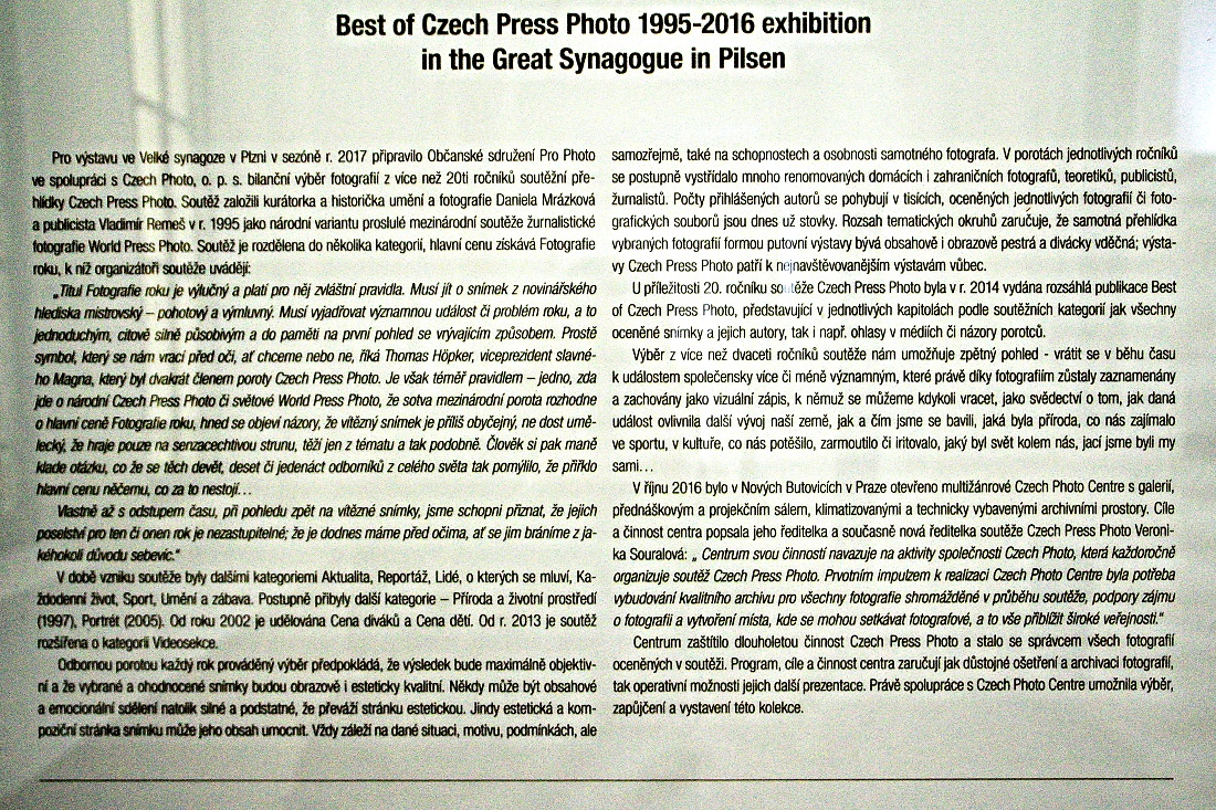 aneb, když fotografové píší historii... Vždycky, když přijdu do plzeňské syngogy mám jisté asociace. Vyvolený národ.. kolektivní vina.. ne, nejsme v tragickém 20.stoletím plném děsivých válečných hrůz, jsme v biblickém starověku.. lidé jsou pořád stejní, pořád někteří vnucují těm druhým tu svojí pravdu .. ...pojďme se tedy podívati do zvláštního jedinečného prostoru, který nám lidem 21.století jakousi transformací hodnot připravil další z mnoha jedinečných a neopakovatelných výstav.. Czech press foto 1995-2016. Jedinečné, neopakovatelně zachycené okamžiky našeho života, toho, který žijeme my, lidé na přelomu dvou tisíciletí. My, jedineční, neopakovatelní, rovnocenní, silní a slabí, smrtelní a nesmrtelní, rovni si sobě bez ohledu na výši svýho konta,nebo kontaktů, ve světě, kde nejvýše stojí Ti, kteří se obětují pro druhé.... výstava je k vidění v plzeňské Velké Synagoze do konce října 2017 a je skutečně ke shlédnutí.. Dne 20.09.2017:Jan Picka Pro reakci na článek musíte být přihlšen |