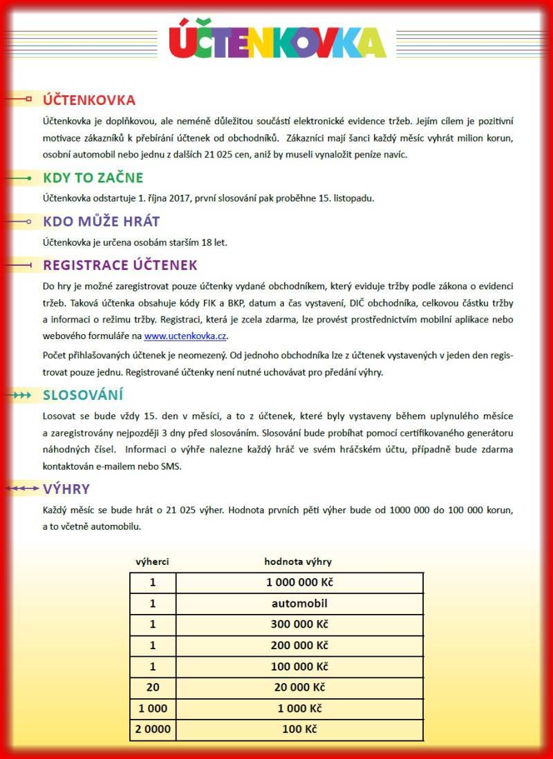 Ministerstvo financí spouští už v neděli … účtenkovou loterii pod názvem Účtenkovka o 21.025 cen v hodnotě od 100 do 1 000 000 korun. Loterie se zúčastníte zaregistrováním EET účtenky, kterou obdržíte při nákupu v obchodě nebo za stravovací či ubytovací služby. Účtenkovka je naplánována na jeden rok. Účtenky vystavené od 1.10.2017 můžete registrovat prostřednictvím formuláře na internetu. Losovat se bude vždy 15. den následujícího měsíce z účtenek, které byly vystaveny během uplynulého měsíce a zaregistrovány nejpozději 3 dny před slosováním. Výhry jsou od daně osvobozeny. Aby nedocházelo k dělení nákupů, je možné od jednoho prodejce zaregistrovat pouze jednu účtenku za den. I když shromažďovat účtenky mohou i děti, tak registrovat se mohou pouze občané starší osmnácti let. Aktuální informace včetně návodů, jak zaregistrovat účtenku, a odpovědi na nejčastější otázky naleznete na internetových stránkách www.uctenkovka.cz, jejichž ostrá verze s registračním formulářem bude spuštěna 1. října 2017. Dne 26.09.2017:Ing. Josef Hrábek Pro reakci na článek musíte být přihlšen |