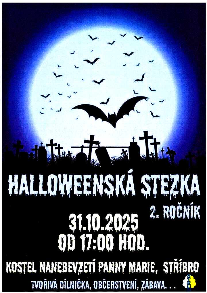 pozvánka na podzimní akci pro děti i dospělé Spolek STROM a skupina přátel vás zve na Halloweenskou stezku 2, která se uskuteční v okolí kostela Nanebevzetí Panny Marie ve Stříbře /Pod Smutečním vrchem/ dne 31.10.2025 od 17.00 hod. Letos jsme pro vás připravili stezku na zajímavějším a velice tajemném místě v okolí kostela NNPM, kde vás bude čekat bohatá světelná výzdoba, tvořivá dílnička, živé akustické vystoupení a malé překvapení nejen pro děti. Občerstvení a něco dobrého na zahřátí je samozřejmostí. Letos bude tedy místo ZAHRAD ...KOSTELÍK.