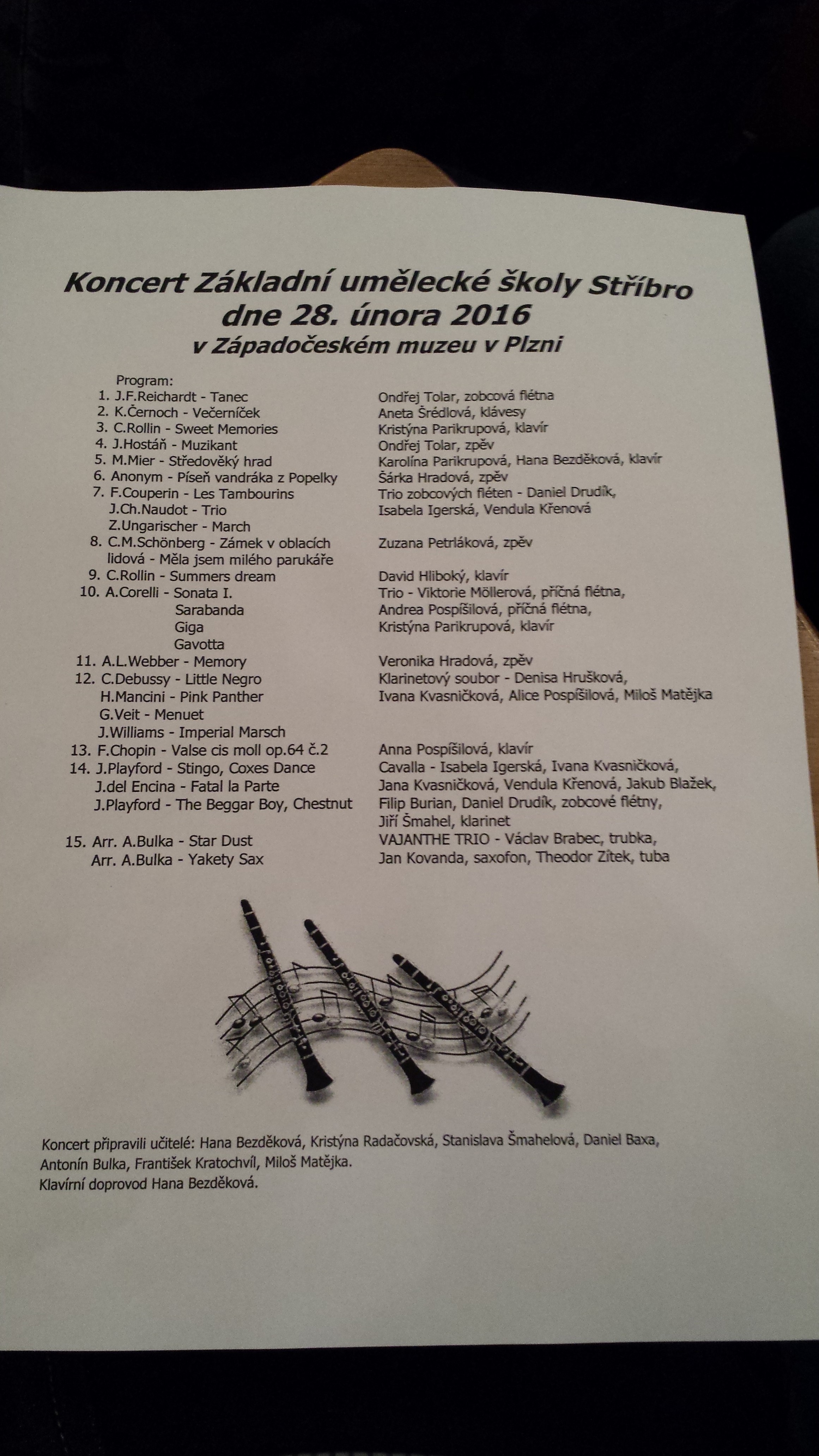 Skladby českých i světových skladatelů zněly sálem Západočeského muzea v Plzni… Stříbrská ZUŠka a její žáci předvedli posluchačům své umění. Město Stříbro děkuje naší Základní umělecké škole za výbornou reprezentaci města. Dne 01.03.2016:Bc. Karel Lukeš Pro reakci na článek musíte být přihlášen |