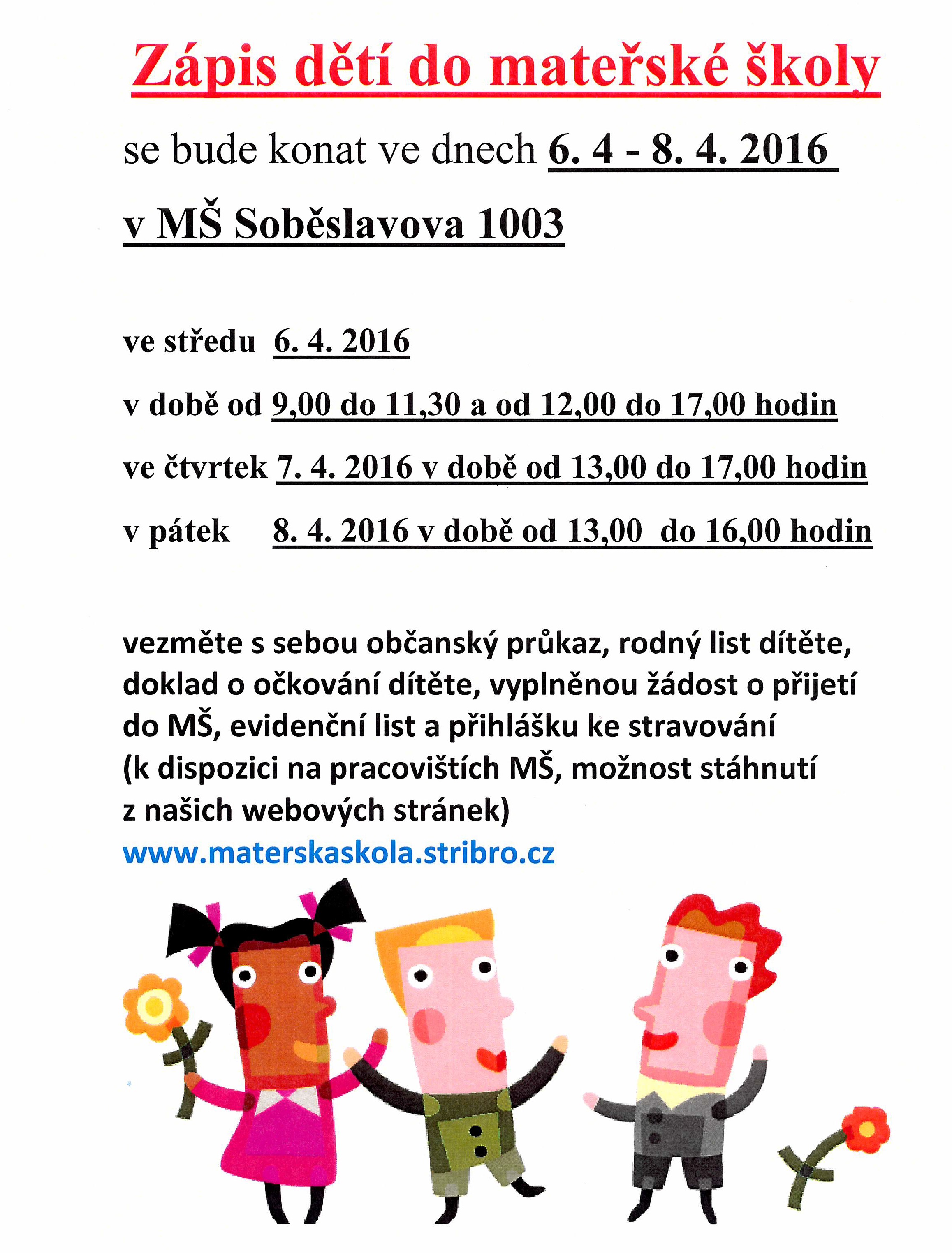 Zápisy dětí do MŠ proběhnou ve dnech 6.-8.4.2016 Rada města schválila dle návrhu ředitelky termíny pro zápis dětí do MŠ pro školní rok 2016/2017. Zápis proběhne v termínu 6. – 8.4.2016 v ředitelně MŠ Soběslavova. Více na přiloženém plakátu. Dne 03.03.2016:Bc. Karel Lukeš Pro reakci na článek musíte být přihlášen |