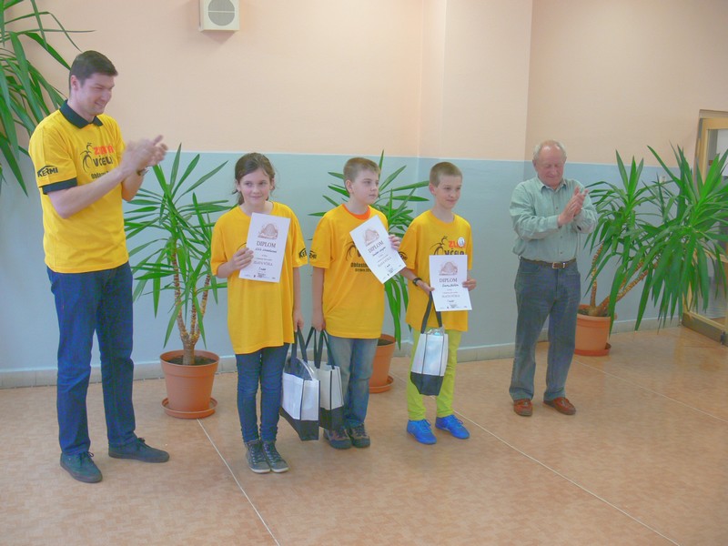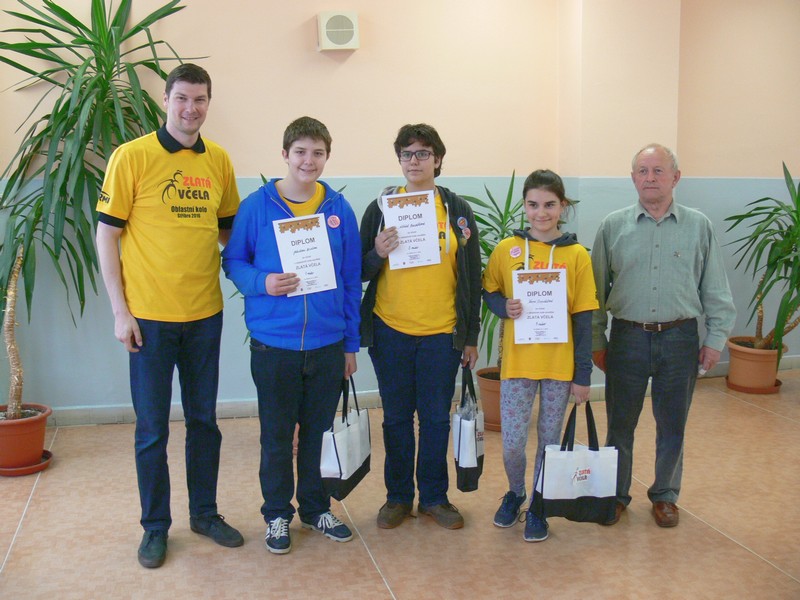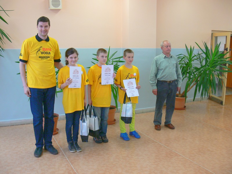 Zlatá včela 2016 V sobotu 23.dubna 2016 se v ZŠ Gagarinova uskutečnilo oblastní kolo soutěže mladých včelařů Zlatá včela 2016. Svoje síly změřilo čtyřicet dva účastníků z devíti včelařských kroužků mládeže V kategorii mladších žáků zvítězil Šimon Blažek z včelařského kroužku mládeže (VKM) Kladruby, jako druhý se umístil David Lang z VKM Stříbro a na třetím místě Klárka Lontscharová z VKM Zruč – Senec. Kategorii starších žáků zcela opanovali členové VKM Stříbro - první místo patří Jakubu Heiclovi, druhé Alžbětě Bezděkové a třetí místo Noemi Pospíšilové. První dva z kategorie starších žáků postupují do celorepublikového kola soutěže Zlatá včela v Nasavrkách, kde budou obhajovat vynikající úspěchy svých předchůdců. Oceněným mladým včelařům přejeme hodně úspěchů do dalšího roku v prospěšné a chvályhodné činnosti. Za úspěšné uskutečnění soutěže patří poděkování sponzorům : radě Plzeňského kraje a radě města Stříbra, firmě KERMI ze Stříbra, stříbrské Mlékárně Ehrmann a ČSOB, rovněž ZŠ Gagarinova