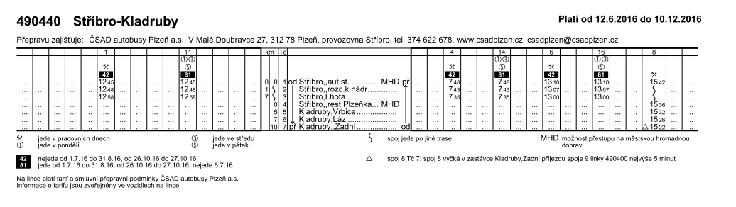 Informace o veřejné dopravě Od 12.6. dojde na lince 490440 ke změně časových poloh u ranního spoje z Lhoty do Stříbra. Důvodem změny jsou technologické problémy oběhu autobusu, který zajišťují tento spoj, kde je autobus již dnes částečně opožděn. Ranní spoj tak pojede o 10 minut později. V příloze zasílám jízdní řád. V případě, že by opoždění spoje činilo problém při docházce dětí do školy, prosím o podání zprávy. Spoj bychom museli upravit od 28. srpna tak, aby nedocházelo k problémům při zajištění dopravy dětí do škol. Předem děkuji za pochopení. POVED s. r. o. Dne 09.06.2016:Jan Vačviric Pro reakci na článek musíte být přihlášen |
