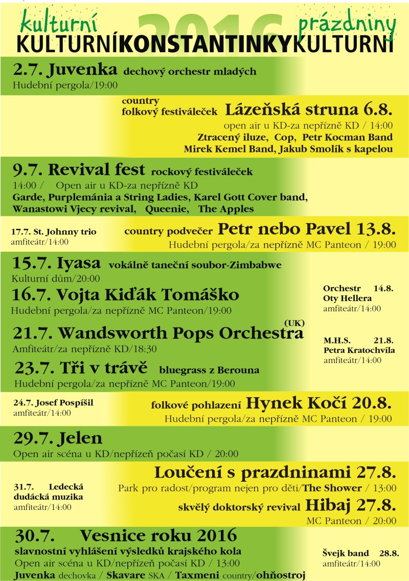 souhrn zajímavého kulturního programu prázdninových Konstantinek Chcete mít pravidelně čerstvé informace o kultuře v Konstantinkách? Není problém, dejte si na facebooku do přátel Kulturní Konstantinky: https://www.facebook.com/kulturni.konstantinky Celkový přehled prázdninového programu viz níže. Dne 04.07.2016:Karel Týzl Pro reakci na článek musíte být přihlášen |