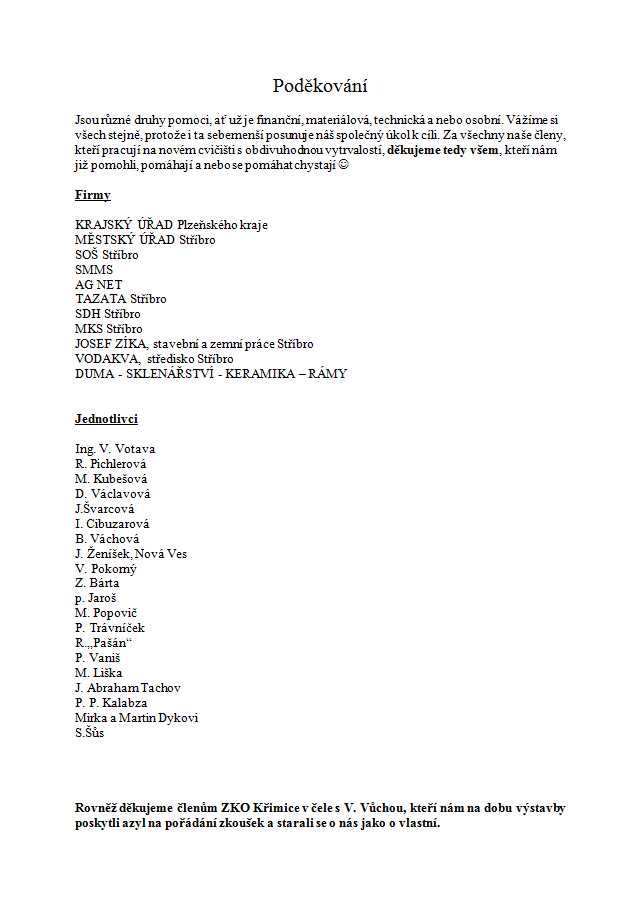 Děkuji všem třiceti členům ZKO 57 Stříbro, kteří za 5 měsíců vybudovali nové kynologické cvičiště doslova z ničeho, kteří dokázali, že i v dnešní době existují hodnoty jako je nadšení pro věc, dobrovolnost, soudržnost, pracovitost, nápaditost a kamarádství. Je to cennější o to víc, že většina členů jsou děvčata, která se "za pochodu" musela naučit betonovat, natahovat pletivo a natírat, staly jsme se kopáči, truhláři i traktoristy. Brigádnické hodiny se přestaly počítat, když jejich počet před měsícem dosáhl tisícovky. Obdivuhodnější o to víc, že polovina našich členů je dojíždějící. Zvlášť děkuji své dceři Stáni, Jarušce Potužákové, Monče Šmolíkové, Janičce Abrahamové, Peťule Lagové, Žanet Šnajdrové, Ivě Ženíškové, Lukáši Pubrdlemu a Sabče Šobrové za to, že vždy byli tam, kde bylo třeba. Děkuji všem nečlenům i organizacím, kteří pomohli, protože i díky nim máme cvičiště, na které jsme pyšní. A i přes to, že je před námi ještě spousta práce, tak máme se svými psími kamarády kde trénovat a můžeme se pokusit posunout kynologii ve Stříbře zase o kousek dál. Závěrem bych chtěla poděkovat našemu administrátorovi M.T. Přerovskému, který spravuje klubové stránky a neúnavně mapuje každý náš krok a Andrejce Popovičové za morální podporu. Ivana Šůsová, předsedkyně ZKO 57 Stříbro