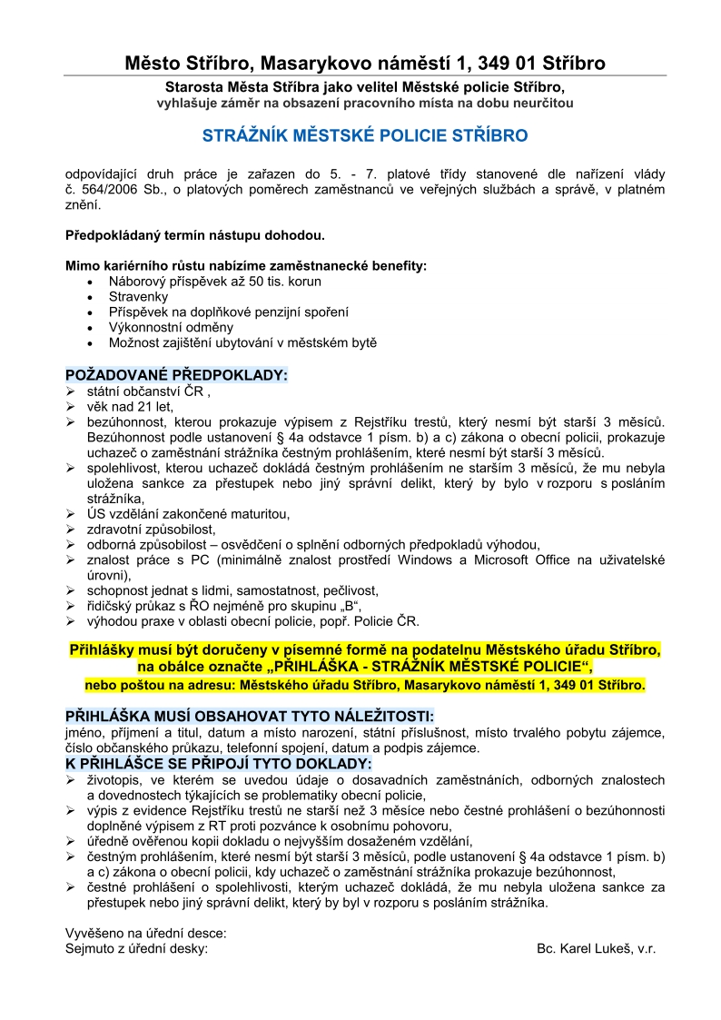 Starosta Města Stříbra jako velitel Městské policie Stříbro, vyhlašuje záměr na obsazení pracovního místa na dobu neurčitou