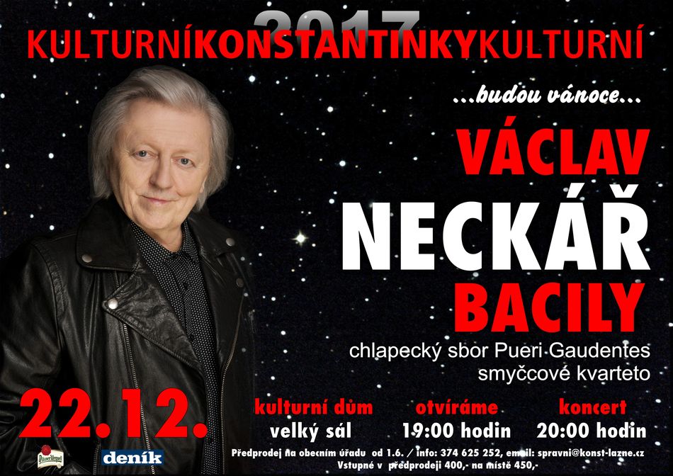 Kulturní program Konstantinek byl doplněn o poslední volné termíny a to ve velkém stylu Konečnou podobu dostaly poslední dvě letošní akce v Konstantinkách. Na zahájení lázeňské a turistické sezóny 19.-21.5 přivítáme mimo jiné legendy Oskara Petra nebo Wabiho Daňka Ke konce roku pak můžete navštívit vánoční speciál Vaška Neckáře za doprovodu Bacilů, chlapeckého pěveckého sboru a smyčcového kvarteta ..... lahůdka lahůdek ...... Vzhůru do Konstantinek ... je to jen za humny :-)