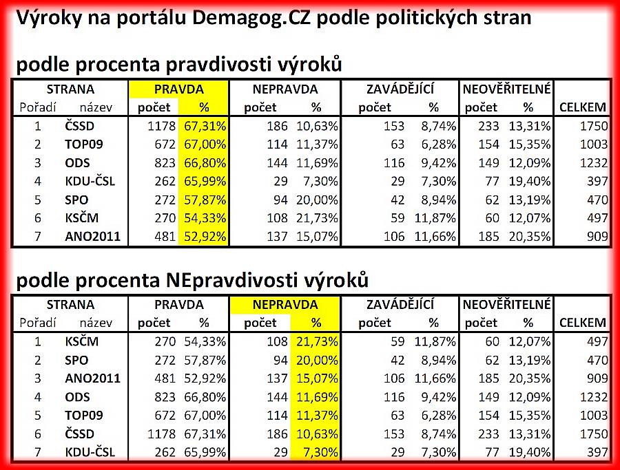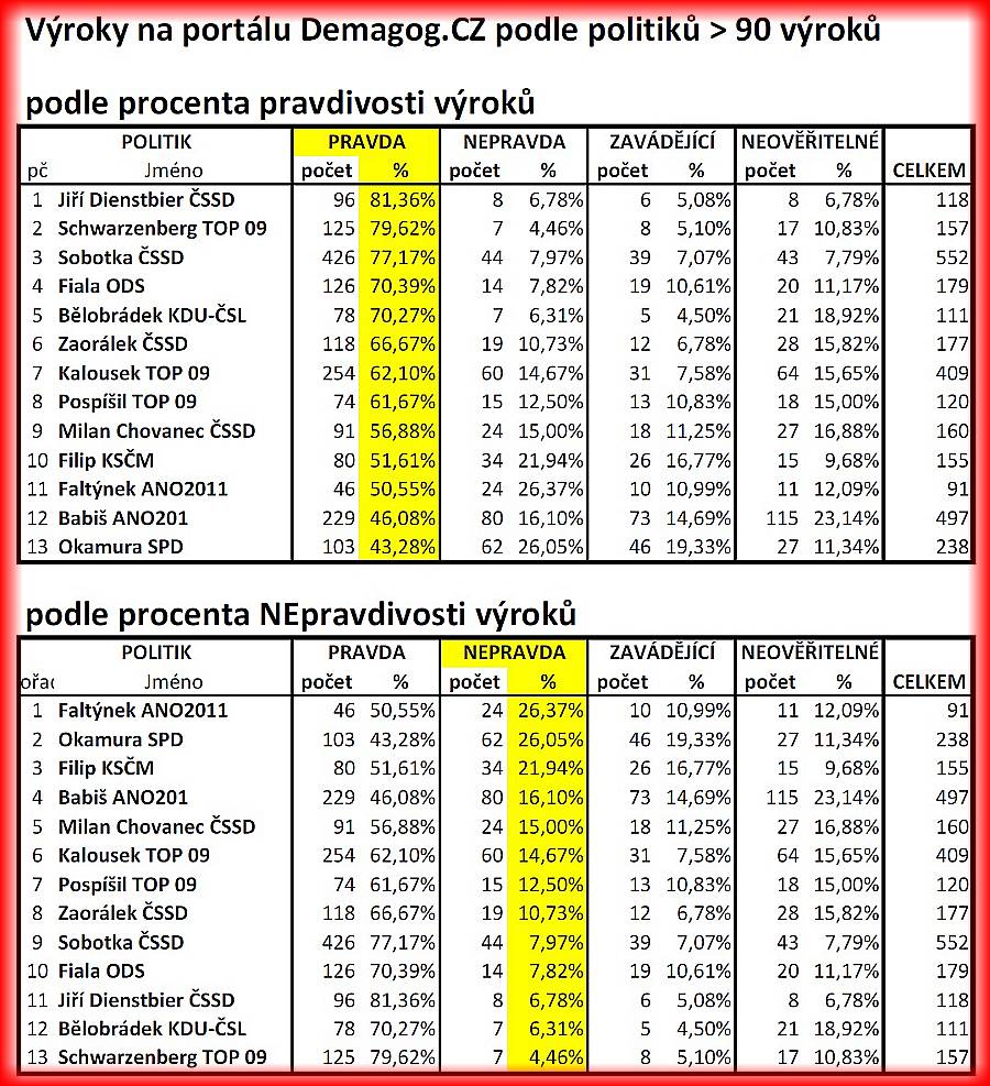 Jak moc lze věřit politickým stranám a hnutím? … Tak tím se zabývají členové týmu webového projektu, který je provozován na internetových stránkách www.demagog.cz. Najdete zde jednotlivé výroky politiků, u kterých je uvedeno, zda se jedná o pravdu nebo nepravdu nebo zda je výrok zavádějící nebo neověřitelný a zároveň si můžete zobrazit zdůvodnění tohoto tvrzení. V přehledu výroků najdete graf výroků podle politických stran a pak graf politiků s nejvyšším počtem výroků. Zajímalo mě ale i číselné srovnání, takže jsem čísla přepsal do tabulek a nechal setřídit jednak podle procenta pravdivých výroků z celkového počtu a pak podle počtu nepravdivých výroků. Tabulku stran jsem vyplnil z grafu stran, tabulku politiků pak z grafu a doplnil jsem další politiky s počtem výroků nad devadesát – výsledek máte na rozkliknutí níže: Dne 11.10.2017:Ing. Josef Hrábek Pro reakci na článek musíte být přihlášen |