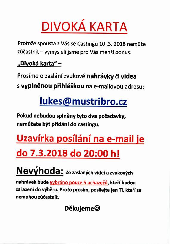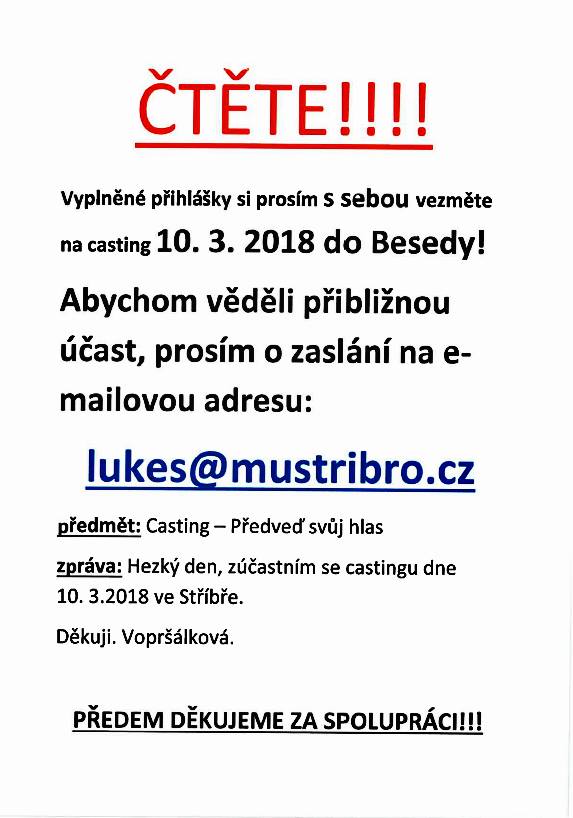Doplněny informace ke castingu - Umíš zpívat? Je tvůj sen zkusit si vystoupit před publikem? Aktualizace: Pokud se nemůžeš castingu zúčastnit, máš šanci poslat svou zvukovou nebo videonahrávku společně s přihláškou do středy 7.3. 20:00 na e-mail lukes@mustribro.cz
