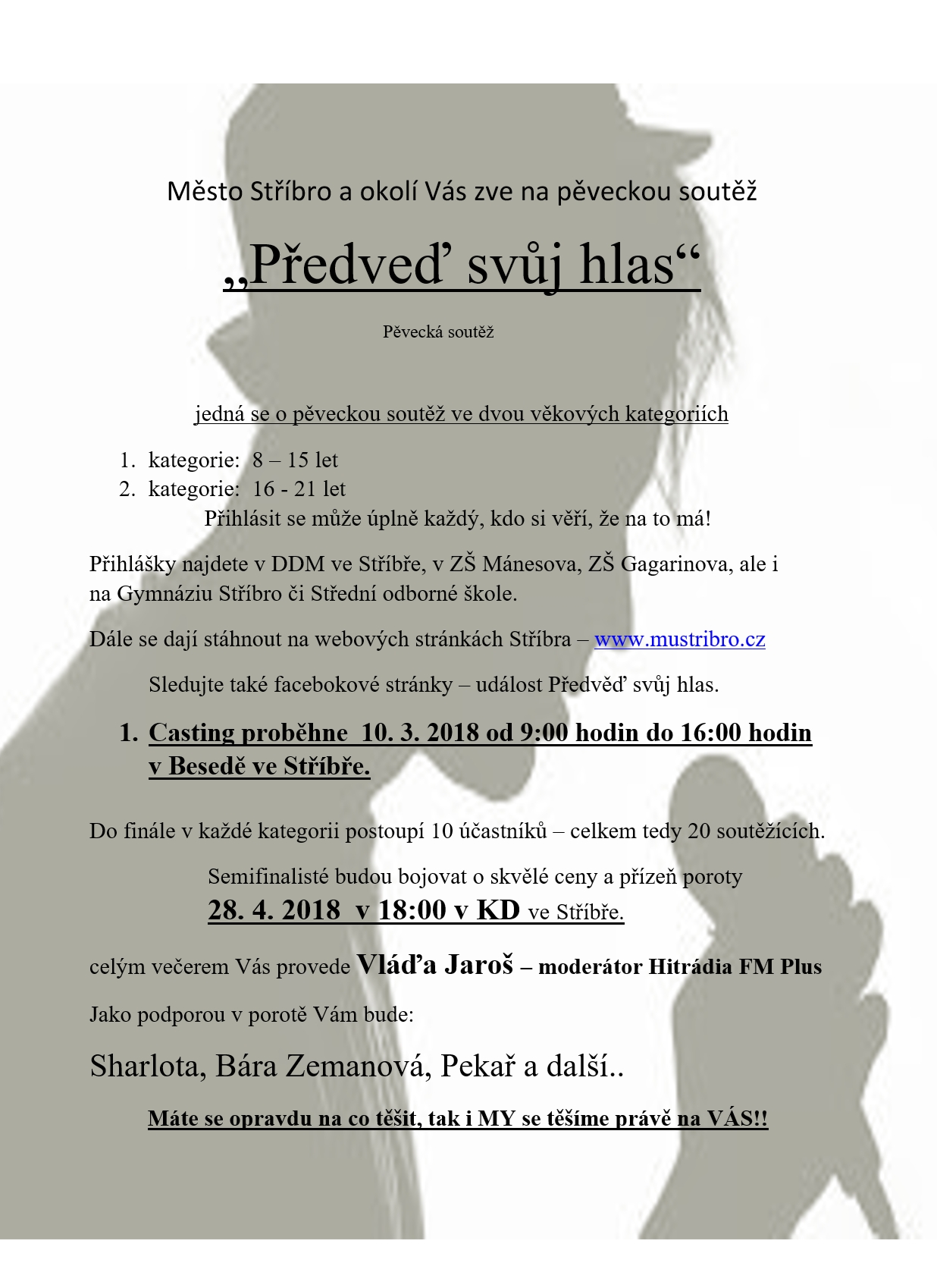 Děkujeme a těšíme se na účast. -------------------------------------------------------- Nyní teď máš tu jedinečnou šanci! Zúčastnit se pěvecké soutěže – „Předveď svůj hlas“ Jedná se o pěveckou soutěž ve dvou věkových kategorií: Přihlásit se může úplně každý, kdo si věří, že na to má! Přihlášky najdete v DDM ve Stříbře, v ZŠ Mánesova, ZŠ Gagarinova, ale i na Gymnáziu Stříbro či Střední odborné škole. Casting proběhne 10. 3. 2018 od 9:00 hodin do 16:00 hodin v Besedě ve Stříbře. Do finále v každé kategorii postoupí 10 účastníků – celkem tedy 20 soutěžících. Semifinalisté budou bojovat o skvělé ceny a přízeň poroty 28. 4. 2018 v 18:00 v KD ve Stříbře. Jako podporou v porotě Vám bude: Sharlota, Bára Zemanová, Pekař a Vojta Drahoukoupil.
