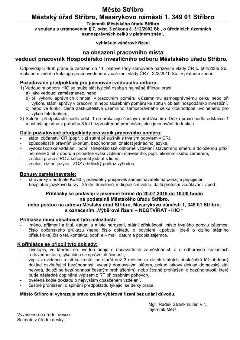 Tajemník Městského úřadu Stříbro v souladu s ustanovením § 7, odst. 3 zákona č. 312/2002 Sb., o úřednících územních samosprávných celků v platném znění, vyhlašuje výběrové řízení na obsazení pracovního místa vedoucí pracovník Hospodářsko investičního odboru Městského úřadu Stříbro. Dne 20.06.2018:Jan Vačviric Pro reakci na článek musíte být přihlášen |