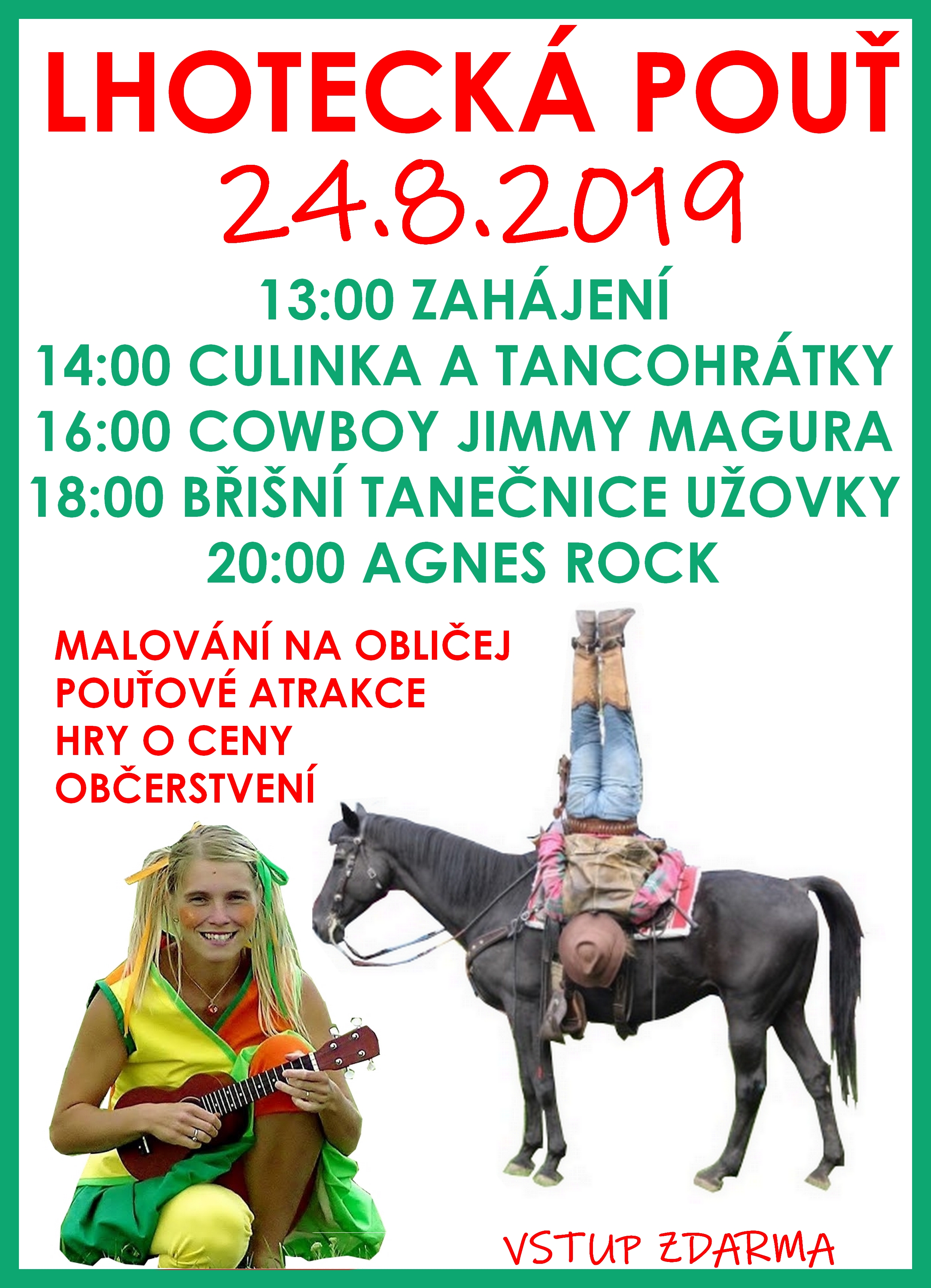 Vážení, moc vás zveme na naši tradiční pouť. Přijďte se pobavit, program je připraven pro všechny! Populární a dětmi milovaná Culinka zaměstná a roztančí naše ratolesti chvíli po obědě. Cowboy Jimmy Magura s jeho čtyřnohým parťákem vezmou dech všem generacím, protože to, co předvádí a jak jsou zžitý, nemá obdoby. Nečekejte klasickou cowboyskou show, ale dvě těla a jednu duši, nekonečnou lásku, absolutní důvěru, oddanost a sehranost mezi člověkem a zvířetem. To prostě musíte vidět. Hned po Jimmym se předvedou v hojným počtu Cheers, které premiérově předvedou svojí novou sestavu a bude to bomba! V podvečer rozproudí krev břišní tanečnice Užovky a navodí správnou atmosféru před večerní zábavou s kapelou Agnes Rock revival. Pro děti máme připraveno spoustu dárků, pouťové atrakce a celý den malování na obličej zdarma. Pro dospělé odvážlivce bude speciální pivní soutěž zručnosti a další hry o ceny. Občerstvení zajištěno! Děkujeme Městu Stříbru, které naši akci financuje. Zahájení zábavného odpoledne je ve 13:00. Tak s kým se v sobotu uvidíme? Těšíme se!! Dne 19.08.2019:Petra Vraná Pro reakci na článek musíte být přihlášen |