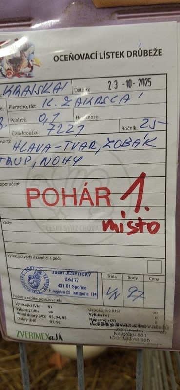 V roce 2024 se Tachovští na regionální výstavě v Kasejovicích umístili ze šesti oblastí na pátém místě. V letošním roce z osmi oblastí obsadili s rozdílem 1,5 bodu příčku čtvrtou. Chovatelům, kteří si udělali čas a své odchovy na „krajskou“ připravili, děkujeme za vzornou reprezentaci a přejeme hodně radosti a úspěchů v chovu. * * * * * V závěru roku vrcholí výstavní sezóna - ještě můžete vidět naše odchovy např. na místní výstavě v Tachově v sobotu 8.11.2025. Ve stejném termínu proběhne 30. Evropská výstava v Nitře, kde bude mít oblast Tachov také zástupce. Vrcholem českých výstav bude ta celostátní, v Lysé nad Labem v termínu 21. - 22.11.2025. Ve Stříbře se sejdeme na chovatelském trhu v sobotu 1.11.2025 a na pátek a sobotu 21.- 22.11.2025 připravujeme výstavu exotického a okrasného ptactva. Dne 28.10.2025:Zdeňka Kantová Pro reakci na článek musíte být přihlášen |