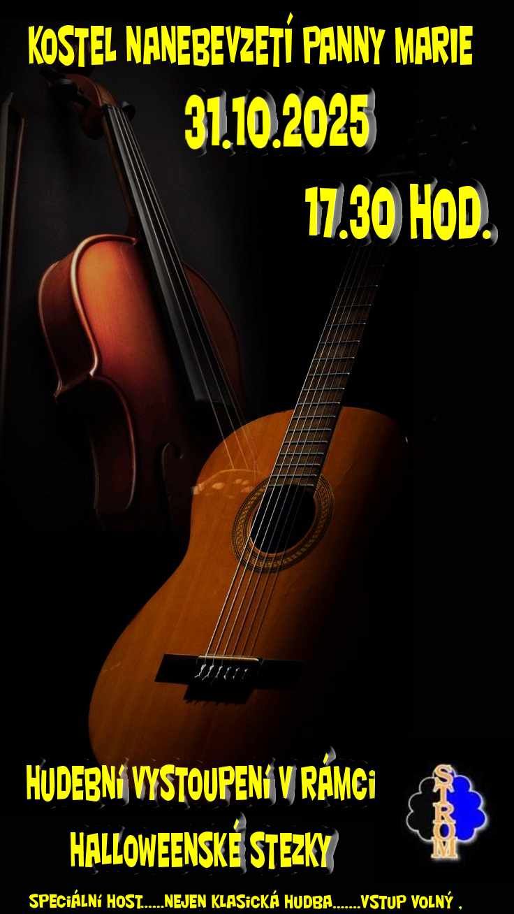 pozvánka na malé hudební vystoupení Spolek STROM vás zve na hudební vystoupení v rámci HALLOWEENSKÉ STEZKY 2025 Stříbro, kostel NNPM 31.10.2025 OD 17.30 hod. VSTUP VOLNÝ.