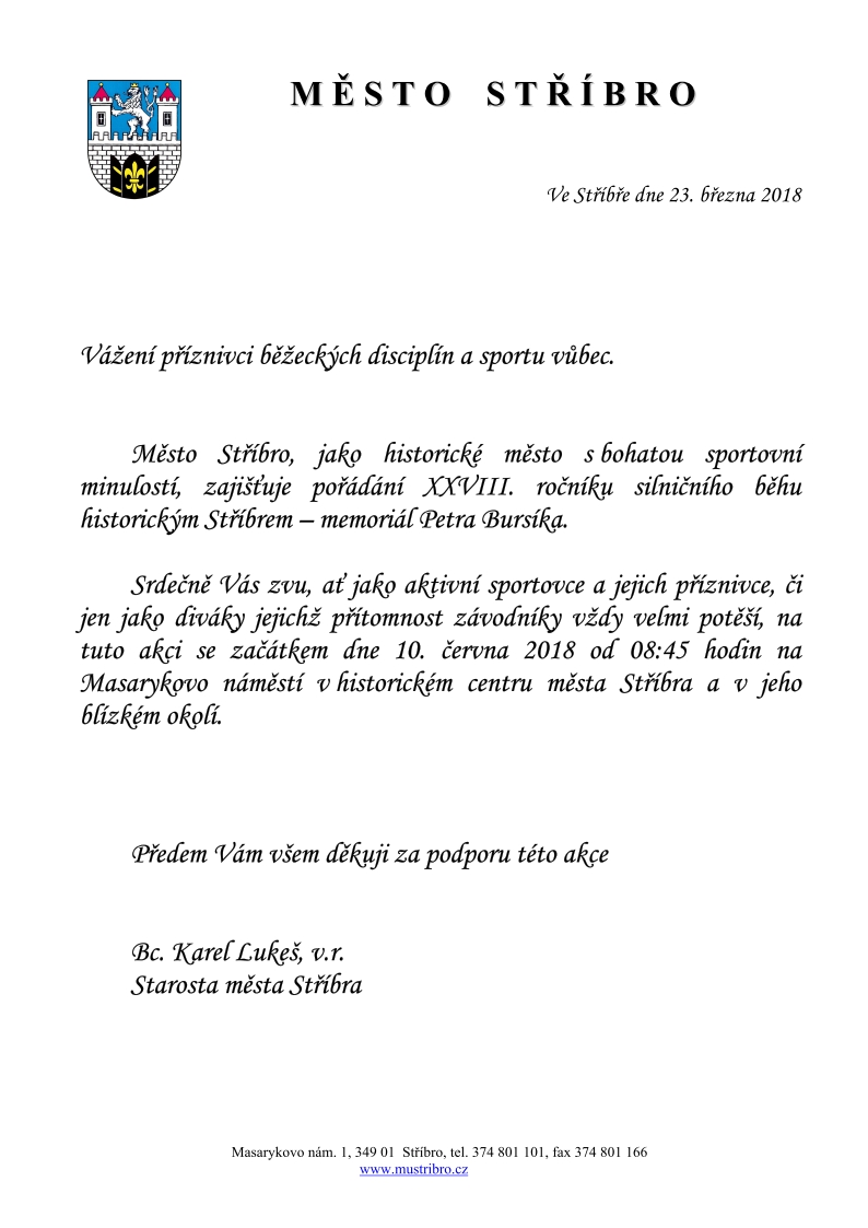 Město Stříbro, jako historické město s bohatou sportovní minulostí, zajišťuje pořádání XXVIII. ročníku silničního běhu historickým Stříbrem – memoriál Petra Bursíka.