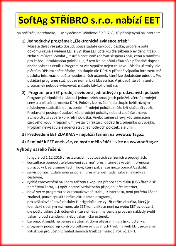 Dne 22.03.2020 v 09:30 Pro výběr pro vás nejlepšího EET řešení potřebujete znát problematiku - Tachov 26.3.2020 nebo Stříbro 8.4.2020. ... Komplexní problematiku EET za vás nevyřeší účetní, tu si musíte řešit sami, nejlépe s předstihem před jejím zaváděním. Abyste si ale mohli vybrat pro vás to nejlepší řešení, musíte znát problematiku EET. Proto jsme pro vás připravili seminář v ideálním termínu před poslední vlnou EET. Jednak by dle příslibu měla být již k dispozici metodika pro podnikatele z poslední vlny EET a jednak na trhu v té době bude již dostatek praxí a konkurenčním bojem zlevněných nabídek. V teoretické části se dozvíte vše, co byste měli vědět o EET a v praktické části krátce možnosti, jak se s EET vypořádat. Seznámíme Vás se zkušenostmi z provozu EET v restauracích, pensionech i obchodech. Na závěr Vám předvedeme EET komunikaci v praxi s připojením na internet, i co se stane v případě, že internet přestane být dostupný. Seminář Elektronická evidence tržeb (EET) je zaměřen na to, jak se na zpřísněná pravidla v evidenci tržeb připravit, co musí podnikatel udělat, aby vyhověl zákonu. Budou probrány základní principy, postupy a povinnosti při elektronické evidenci tržeb, vymezení evidované tržby, jak dělat storna a opravy evidované tržby, jak evidovat tržbu v případě zastupování jiným podnikatelem či evidence tržby ve zjednodušeném i zvláštním režimu. Dozvíte se, které tržby jsou vyloučené z evidence tržeb. Budou osvětleny pojmy autentizační údaje a certifikát pro evidenci tržeb či doba odezvy. Dozvíte se o možnostech technických řešení. Seminář se koná v Tachově v bývalé restauraci Lidový dům, Prokopa Velikého 497 – vchod zprava po prvních schodech (bez občerstvení). Ve Stříbře pak v salónku Motorestu U Rumcajse v Těchlovicích (ze Stříbra výjezd směr Cheb, v Těchlovicích po pravé straně). Svoje automobily parkujte na zahradě restaurace, vjezd vlevo od budovy motorestu. V restauraci se lze občerstvit i dobře najíst, podívejte se na jídelní lístek. Prezence 15 minut před zahájením. Nejdříve bude probrána obecná (teoretická) část a návazně pak možnosti praktického technického řešení včetně předvedení EET komunikace v praxi. Registraci na seminář provedete -ZDE- nebo přihlášku níže vytiskněte, vyplňte a naskenovanou pošlete e-mailem nebo pošlete poštou. Přihláška je považována za závaznou až po zaplacení odpovídající částky.