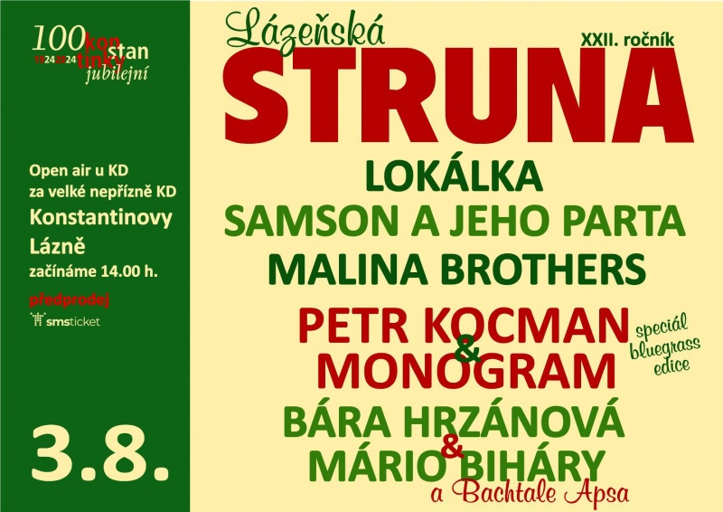 Dne 03.08.2024 v 14:00 XXII. ročník zajímavě obsazeného country folkového festiválku je tady Dvacátý druhý ročník nejstaršího konstantinolázeňského festivalu se uskuteční tradičně první srpnovou sobotu. Program na open air scéně u kulturního domu začne ve 14.00 hodin a představí se v něm opět skvělá hudební sekupení české country folkové scény: